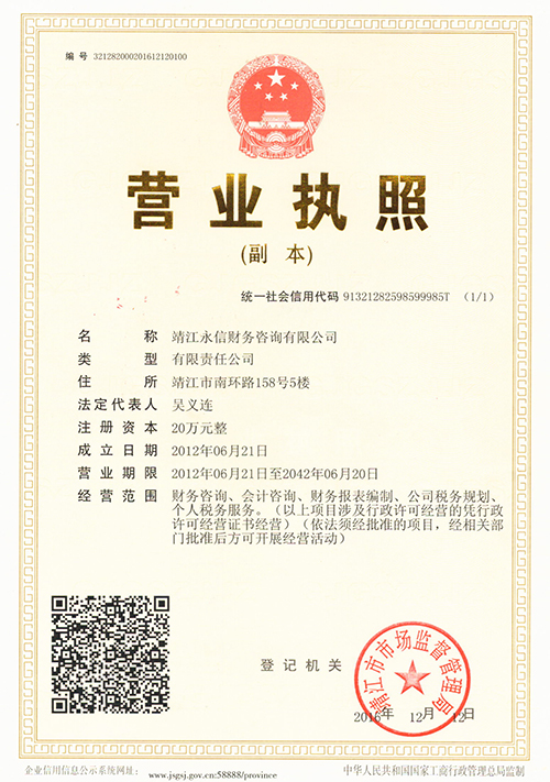 靖江永信財(cái)務(wù)咨詢有限公司是依法注冊(cè)成立的專業(yè)財(cái)稅代理機(jī)構(gòu)。公司主要業(yè)務(wù)為:代辦公司營(yíng)業(yè)執(zhí)照、注冊(cè)各類公司、代理記賬報(bào)稅,代理商標(biāo)注冊(cè),工商年檢,稅務(wù)登記年檢,企業(yè)清理注銷等,注冊(cè)香港公司,代辦申請(qǐng)一般納稅人資格認(rèn)定,公司專業(yè)為中小企業(yè)進(jìn)行納稅籌劃,代理記賬報(bào)稅,企業(yè)內(nèi)部審計(jì);同時(shí)也專業(yè)代理進(jìn)出口經(jīng)營(yíng)權(quán)申請(qǐng)。